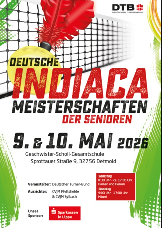 Am Wochenende des 09./10.05.2026 ist es endlich soweit und die SG des CVJM Sylbach/Pivitsheide darf die Deutschen Senioren Meisterschaften des Deutschen Turnerbundes im Indiaca austragen. In drei Spielklassen treten erfahrene Spielerinnen und Spieler gegeneinander an. Die Spiele werden in den Sporthallen der Geschwister Scholl Gesamtschule und der Heinrich Drake Realschule in Detmold ausgetragen.